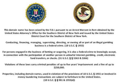 As a result, if you attempt to visit what had, until days ago, been the world's largest online poker sites, this is the creepy, authoritarian image which greets you -- effectuated, of course, without the need to convict anyone of anything in a court of law: