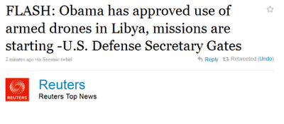 Regarding the announcement yesterday that the 2009 Nobel Peace Prize winner was now deploying these same flying death robots to Libya, both The Washington Post's David Ignatius and The Atlantic's James Fallows make the case against that decision. In particular, Ignatius writes that "surely it's likely that the goal was to kill Libyan leader Moammar Gaddafi or other members of his inner circle."