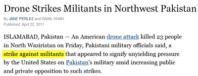 When I saw that, I was going to ask how the NYT could possibly know that the people whose lives the U.S. just ended were "militants," but then I read further in the article and it said this: "A government official in North Waziristan told Pakistani reporters that five children and four women were among the 23 who were killed." So at least 9 of the 23 people we killed -- at least -- were presumably not "militants" at all, but rather innocent civilians (contrast how the NYT characterizes Libya's attacks in its headlines: "Qaddafi Troops Fire Cluster Bombs Into Civilian Areas").