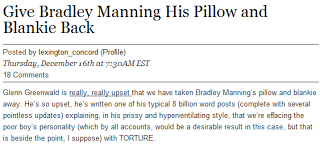 (3) There's an emerging theme circulating in some precincts that those protesting the conditions of Manning's detention are somehow acting improperly because they ignore -- and even implicitly endorse -- all the other cases of prisoners in the U.S. being held in prolonged isolation. This claim was first concocted by James Ridgeway and Jean Casella in a recent Op-Ed in The Guardian, in which they glaringly fail to identify a single person guilty of these accusations, opting instead for the consummately cowardly and slimy reliance on the "some say" strawmen tactic favored by mendacious politicians. Thus we find accusations hurled at the following, all without names, citations or even links: "many have argued . . . . progressive commentators . . . these writers – and their readers, if comments are any measure . . . they depict . . . writers and readers make the point . . . . We have also seen articles suggesting. . . . "
