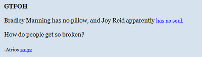 UPDATE: This is a perfect sign of the times. Here's former Obama campaign press aide Joy Reid this morning on the controversy over Manning's detention: