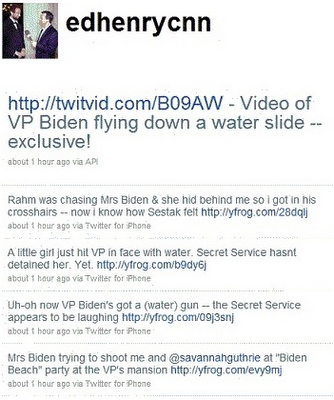 On Friday, CNN's Ed Henry posted a series of giggly, adolescent updates on his Twitter feed, describing the events that took place at a "beach" party thrown by Joe Biden, at the Vice President's mansion, for various "reporters" and White House officials. Digby excerpted just a sampling of Henry's giddy outburst: