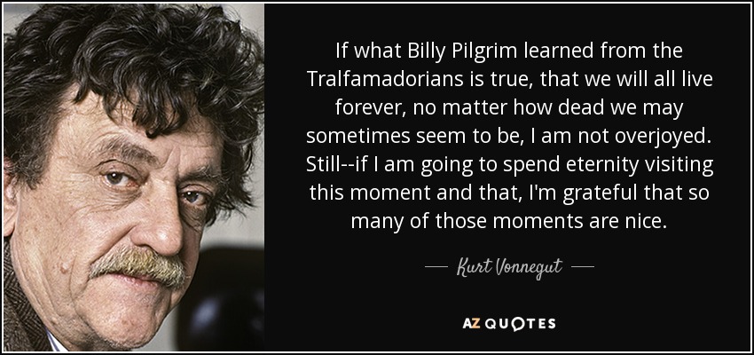 Tralfamadorian–if you know you Vonnegut, you know the Tralfamadorians, little aliens who look like plumber's friends, with a hand where their head should be, in which is set a single eye. They also live in four dimensions, which means that they can see all of time--and choose, quite sensibly, to live in the good times. This is my philosophical stance.
