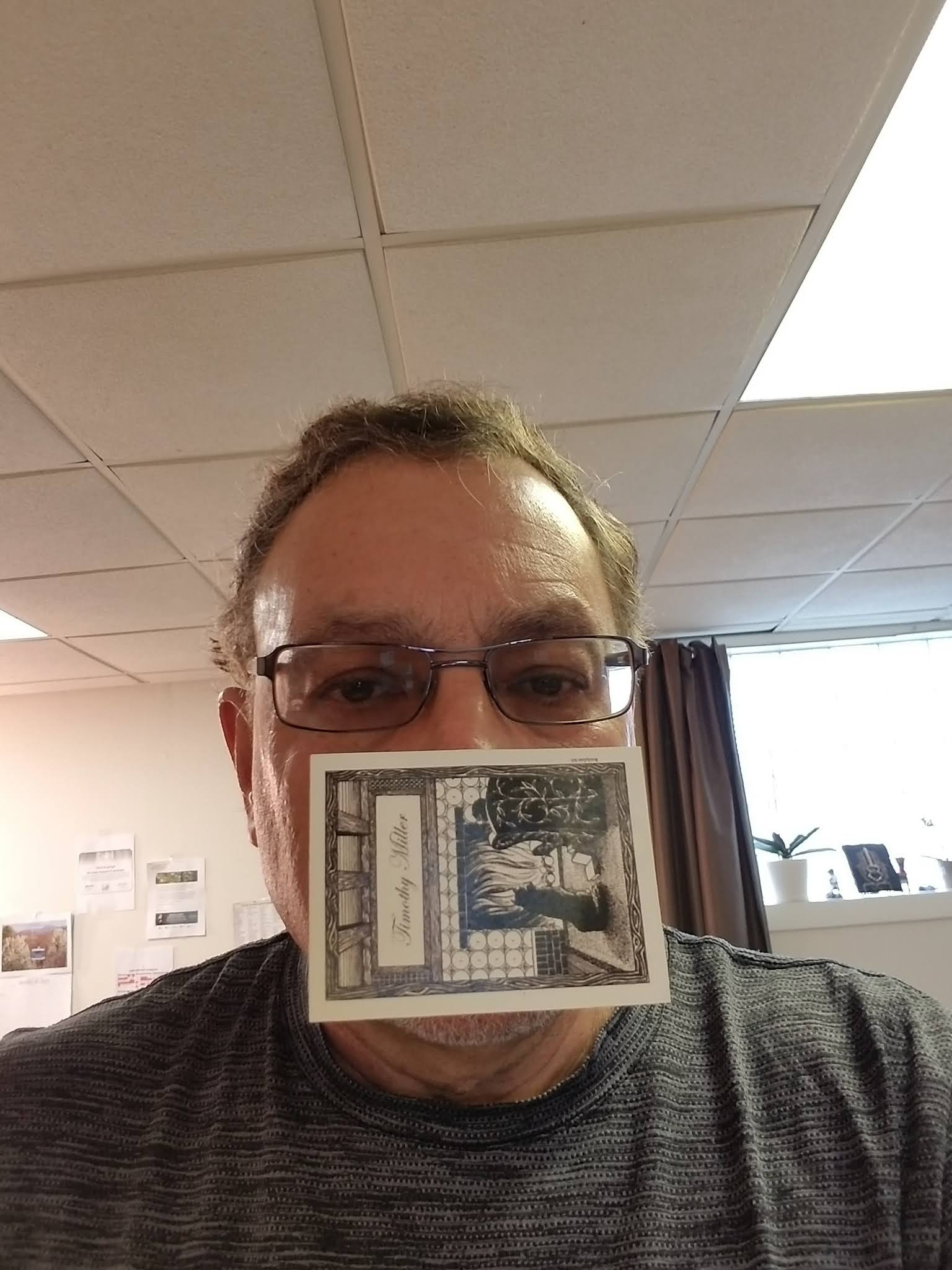 Phil Krampf presses his free bookplate into service as a Covid mask. Desperate times call for desperate measures. If you'd like a bookplate to press into your copy of the novel, just send me your address in an email on the right. Neither address will be sold or shared with anyone, may the gods strike me dead.