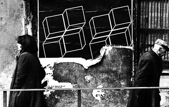 Non sembra però sufficiente limitarsi a questi aspetti formali. Avanziamo dunque l’ipotesi per cui il manifesto abbia una duplice funzione. In primo luogo è la palestra entro cui il progettista si allena, cimentandosi nella sua lotta contro l’inessenziale, che in quanto spreco è immorale, osceno. In secondo luogo il manifesto è strumento di riforma del mondo, o meglio di purificazione, difatti i poster perlopiù vuoti e acromi di Fronzoni vanno a coprire, e dunque emendare, pezzi di mondo. Dato che ormai questi poster abitano soltanto gli ambienti asettici della galleria o del catalogo, non è facile legittimare la nostra ipotesi. Una piccola conferma ci è però data dal manifesto per la mostra di Fontana alla Galleria La Polena di Genova. Fronzoni omaggia il celebre taglio dell’artista che fa della tela una superficie da varcare producendo così un oltremondo. Ci viene inoltre in aiuto una fotografia del 1979 che mostra i manifesti affissi su un muro di Genova, semilacerati: forme geometriche fluttuanti su uno sfondo nero sembrano appartenere a una dimensione platonica che si rivela attraverso uno squarcio. Sono le logiche geometrie del manifesto a coprire il disordine del mondo o viceversa è il caos delle cose che impedisce all’ordine nascosto di emergere? Un gioco di profondità palesa un orientamento verticale: ricoprire vuol dire al tempo stesso disvelare. È Fronzoni stesso, in uno dei suoi rari scritti, a parlare a proposito del bianco e nero, di «nuove e insospettate realtà» che ricordano i misteri celesti del cielo notturno.