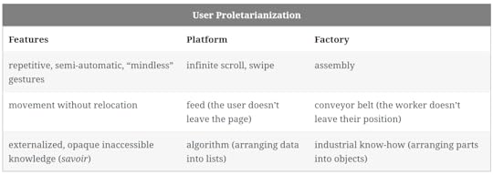 Such statement, having to do with the shifting agency of ordinary users (the very topic of an upcoming post), seems very much to substantiate the proletarization hypothesis, if we think of it as the worker’s alienation from the tool. At the same time Graham points at some openings for direct, synchronous collaboration, which is antithetical to alienation: