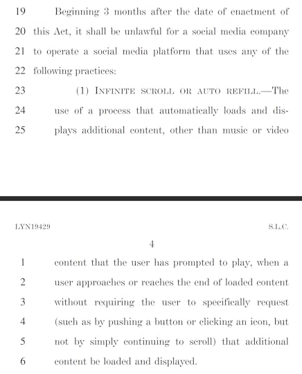 2019: California Senator Josh Hawley wants to ban infinite scroll, autoplay, and the elimination of “natural stopping points”.
