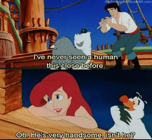 Turns out that Ariel’s actually afraid of birds, but she follows Scuttle to a lagoon and he tells her that the goblet is actually a gift that humans give to their very favourite birds and starts bragging about all the humans he’s met (pfff, bet he’s never met HANS CHRISTIAN ANDERSEN, though, has he?)