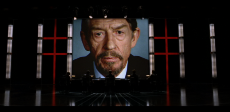 We cut to Norsefire Party headquarters where the leaders of the regime are being berated by John Hurt’s massive head looming over them like frickin’ Zordon.
