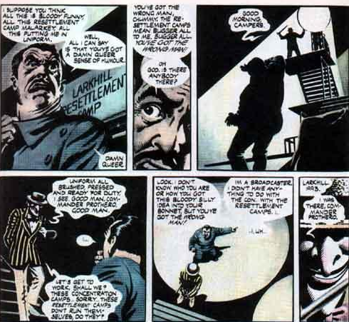 Larkhill was a medical research centre set up by “Suttler’s party”. Which party that is is not stated. We see Suttler speaking at a Norsefire rally but Rookwood also calls him a “Conservative” politician so maybe he was a Tory at the time? Or maybe it’s just “small c” conservative. Anyway. Before Larkhill is destroyed by V, they are able to extract a viral agent from V that they turn into a biological weapon.Creedy suggests unleashing this biological weapon on the British public under the guise of an Islamic terrorist attack. In the ensuing panic, Norsefire sweeps to power and turns Britain into a fascist state.What’s the problem? Well, as an origin story for how Britain succumbed to fascism it requires that even before Norsefire seized power they were already operating concentration camps with the support of the military and rounding up gays, socialists, non-whites and Muslims (as we saw in Valerie’s testament). Got that? Britain became fascist when the fascist party that was already apparently running the country...took control of the country. In which case why bother with a strategy as insanely risky as virus-bombing your own population?