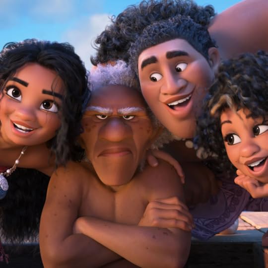 So I do have to give credit where credit is due. If I hadn’t known that this animation was originally intended for a TV show I would not have been able to guess. It’s not quite as good as Moana but definitely of a canon-worthy standard. Mostly. It’s a little inconsistent. Lighting and water effects are fantastic, human skin sometimes looks a little plasticky, hair is a mixed bag. But overall, yeah. Movie looks really good. If looks were everything, this film would be doing just fine. On an abandoned island Moana finds an old clay pot depicting human figures and excitedly takes it back home to Motonui. We meet some returning characters like Moana’s parents, and some new characters; grumpy old farmer Kele, storyteller and Maui fanficcer (yes, the movie actually calls his work “fanfic”) Moni and Bronze Age quirky STEM girl Loto. Of these three Kele is by far my favourite, simply because in a franchise so youth-obsessed as the modern Disney canon, having an old grumpy character feels like a welcome call-back to Disney’s earlier years and also because I just vibe with this guy.