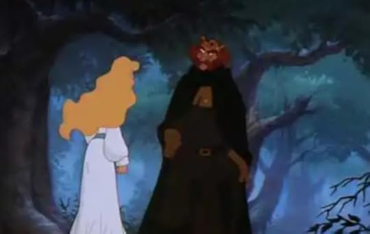 While all that’s going on, however, we meet our villain, Rothbart, an evil sorceror voiced by Jack Palance. And that sounds like a great idea right? Unfortunately, Rothbart is probably the most mismanaged element of the whole film. Firstly, the name. That’s not the movie’s fault, of course, Rothbart is the villain of the original ballet but still. Rothbart. We’re already starting in debt. Second, let’s look at this design: