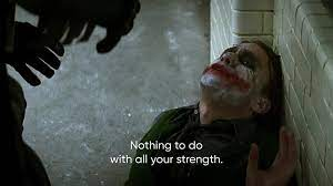 He yells at Joker, asking him what he believes in and Joker responds with the famous line “I believe that what doesn’t kill you makes you…stranger.”