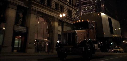 When we first see Ledger’s Joker he’s waiting by the side of the road, perfectly, utterly still. Not simply standing but almost…offline. Like a character in a joke, he doesn’t even exist until the joke is told. He gets picked up in a car by two other hoods wearing clown masks and they head off to the bank. Watching it again and knowing the twist makes the scene even better and even more darkly funny. I could gush all day about all the wonderful little details, like how the Joker is wearing a mask based on one used in an episode from, of all things, the sixties show. What we see in this sequence is the World According to Joker. No one can be trusted. Nothing is as it seems. Everything is a lie and everyone is being lied to, including us, the audience. As the clown robbers kill each other one after the other the bank manager (William Fichtner) comes out of his office blasting a shot gun because it turns out this is an eeeevil bank run by criminals.