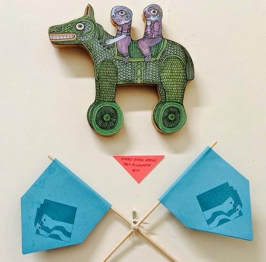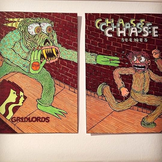 The Chase Scenes anthology book release and art show was tonight. I hope a lot of people came out for it. It was cool to see this photo of my woodcut on the wall along with these awesome Gridlords flags. As soon as I have copies of my own, I'll make the anthology available on my etsy shop.