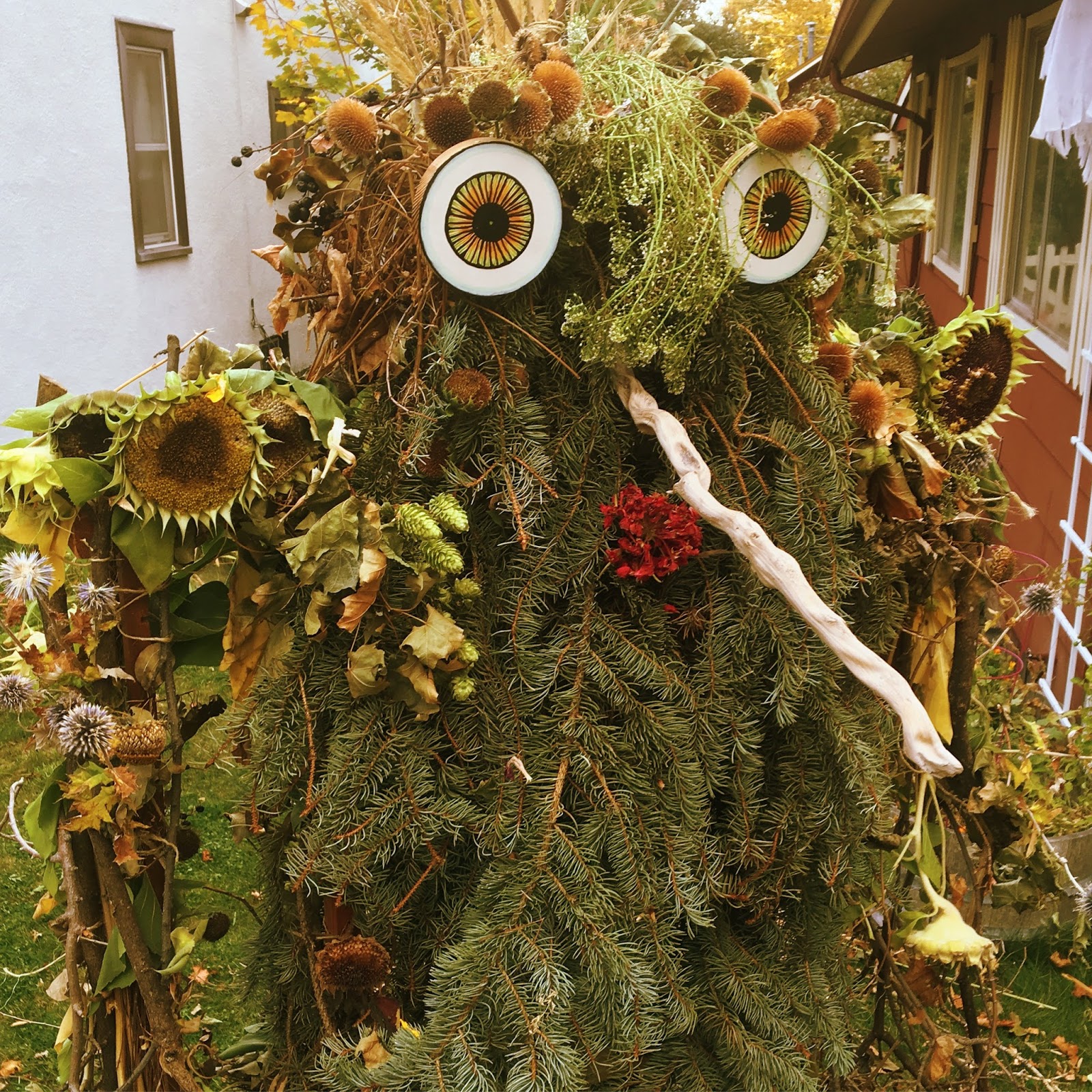 I'm excited for our new family tradition: I built a 7 foot tall person shaped frame with woodcut then we used rough twine to attach dead plants, yard waste and old flowers to create an Autumn Harvest Monster. It was incredibly satisfying and a great way to bring in the new season.