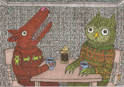 This little drawing was commissioned by a fellow named Nick for his lady, Suzy. He sent me a list of things she likes and I fit a few together. Drawing sweaters is strangely satisfying. I don't do commissions too often, but this one came along right when I had a spare moment.