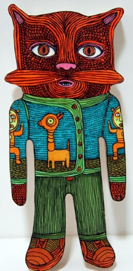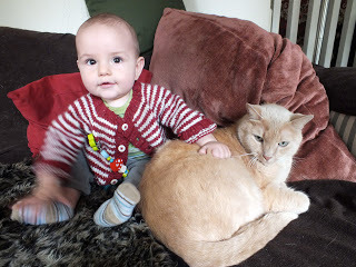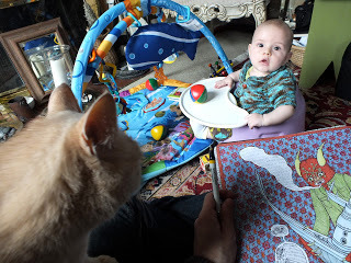 When we first brought Griffin home I wasn't sure how Mortimer would take to him. When I held up our new baby so he could have a look, he smelled his forehead for awhile then rubbed his face on each of his tiny hands. They've been friends ever since. Griffin's totally crazy about him, and Mortimer is amazingly patient with having his face grabbed. They've both been great company to me while completing my upcoming book and working on all the pieces for my solo art show that's opening later this month. These are good times!
