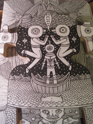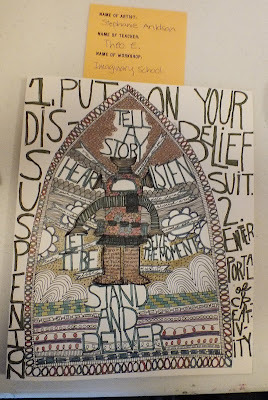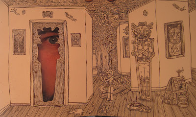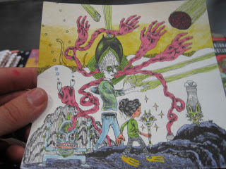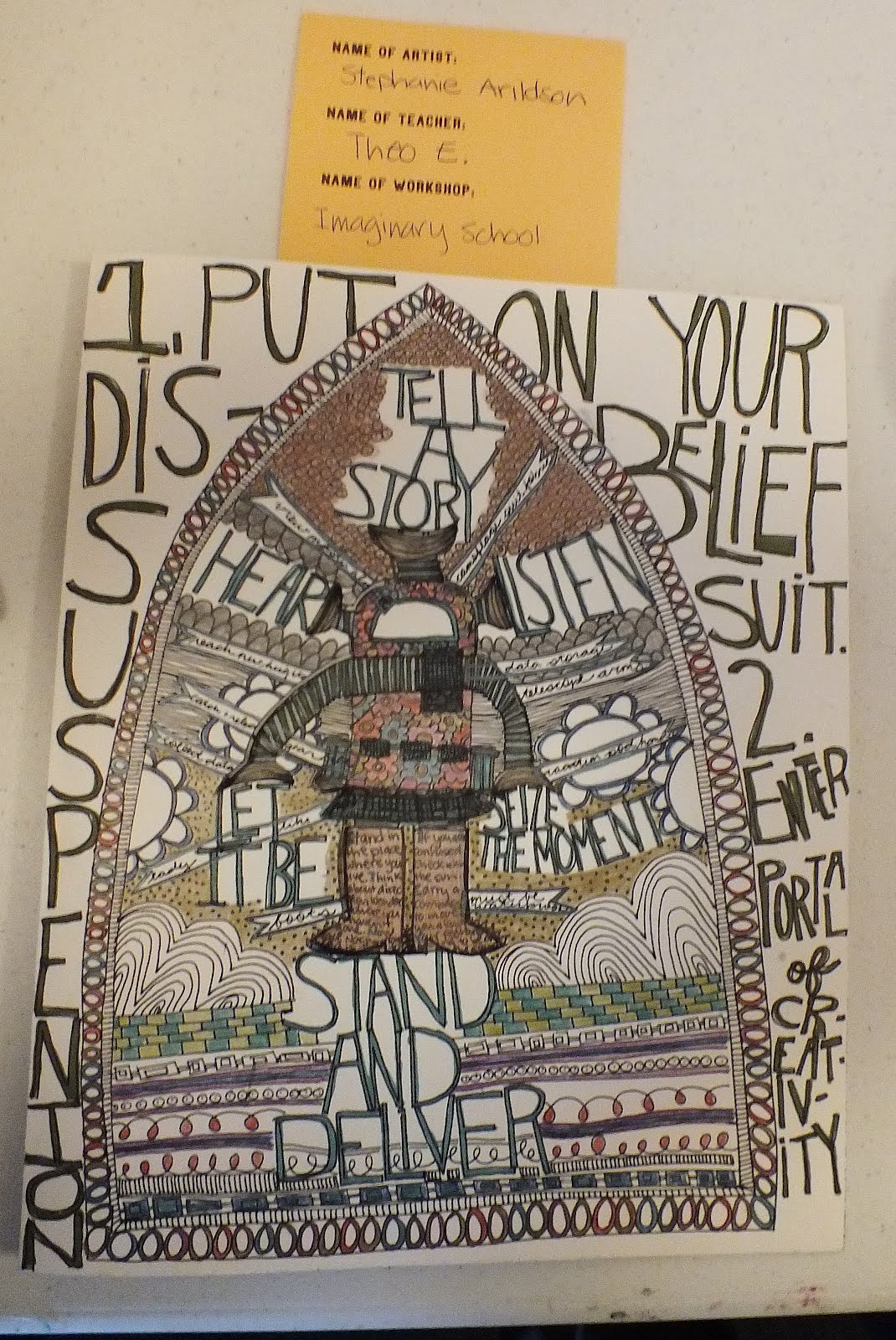 I was really excited about how my workshop at ArtFest went this year. I had a room full of amazing students and they were a pleasure to spend the day with. In my Imaginary School, we covered such topics as Mind Technology powered Disbelief Suspension Suits, hand drawn Multi-Dimensional Doorways, and cut and paste as teleportation. They all did so well! A lot of people asked if I would be teaching this class again. I'd like to. Teesha and Tracy Moore are the ones who first encouraged me to teach and I took up the challenge as a way to get more involved in the amazing world they created with ArtFest. I haven't taught anywhere else. Now that ArtFest is ending, I'm not sure where I'd teach. They created the perfect environment and made me feel like I could put myself out there in that kind of way. I think it'd be fun to teach at their studio in Seattle, The ArtFest Annex sometime down the road. Getting to see my students drawings take shape and getting to know them all a little over the course of the workshop was truly thrilling. I wish I could've gotten better photos of everyone's projects. Here's a couple of the clearer photos I took at the closing gallery event: