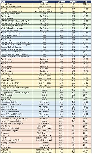 As to other works in the sales, there are only 68 titles in the Sci-fi and Fantasy category, and authors that are featured include George R. R. Martin, Brandon Sanderson, Terry Brooks, Robert Jordan, John Scalzi, Andrzej Sapkowski, R.A. Salvatore, N. K. Jemisin, Gene Wolfe, Anthony Ryan, Miles Cameron, Seanan McGuire, Sarah J. Maas and many more.