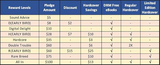 es of the campaign (noon to 12:15 PM). So, you still have to be quick to nab one, but not nearly as fast as in the past. Here's a list of them:Digital Early Bird - $8 instead of $10 for ebook onlyHardcover Early Bird - $28 instead of $35 for ebook AND regular hardcoverRare Early Bird - $60 instead of $75 for ebook AND limited edition faux leather hardcoverReward levels vary from $5 to $100 and this chart explains what is in each level: