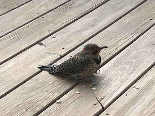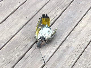 This last autumn a Northern Flicker (a good size woodpecker) rammed the window and lay for about an hour on the deck.