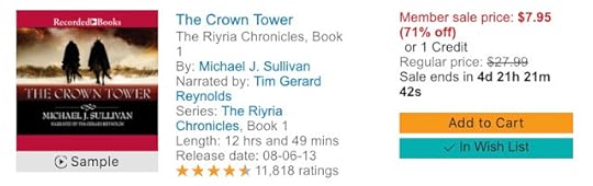 For those who have enjoyed the Riyria Revelations but have yet to dive into the Riyria Chronicles, now is a great time to do so because The Crown Tower (first book in that series) is on sale on Audible. The book has 11,329 4- and 5-star reviews and 9,160+ are 5-stars. So, I think I can safely recommend it.