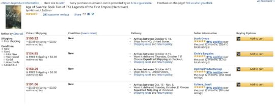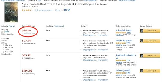 If you follow this blog you may be aware of a little mission Robin and I set out on. You see, recently Del Rey put the hardcover edition of Age of Swords out of print, and the third-party resellers on Amazon had a field day, taking the $28 hardcover and jacking up the price to astronomical levels. For instance, on 9/22 the prices for a new copy ran between $100.92 - $191.06.