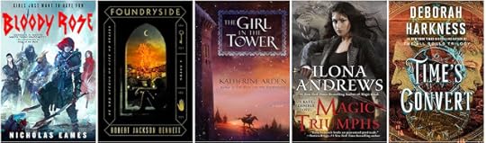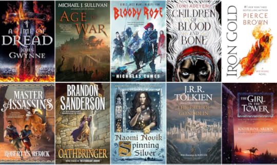 Title Author Rating # Ratings # shelved A Time of DreadJohn Gwynne4.471,0315,769Age of WarMichael J. Sullivan4.473,76418,415Bloody RoseNicholas Eames4.391,7508,624 Children of Blood and Bone Tomi Adeyemi4.2845,682183,220Iron GoldPierce Brown4.2621,14172,530Master AssassinsRobert V.S. Redick4.186584,466Oathbringer Brandon Sanderson 4.6359,709142,362Spinning SilverNaomi Novik4.3215,22569,506The Fall of GondolinJ.R.R. Tolkien4.085937,812The Girl In The TowerKatherine Arden4.4217,31952,275