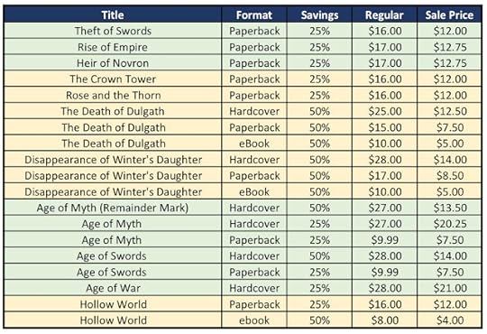 Are you looking forward to the holidays? Do you want some great savings on my books? Well, I certainly want to help make it easier on your pocketbook this time of year. So, starting today (and continuing through December 11th), all my books are on sale for 25% - 50% off! My past holiday sales have been at a 20% discount, but I have a lot of excess stock (particularly Age of Swords) and I'm deeply discounting the titles, so I don't have to pay for storage. Here are some examples of the savings you can receive.All three hardcovers of Legends of the First Empire now just $48.50 (regularly $83)All three trade paperbacks of The Riyria Revelations, now just $37.50 (regularly $50)All four trade paperbacks of The Riyria Chronicles, now just $40.00 (regularly $64)Here's a breakdown of what's on sale and the savings you'll find.