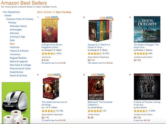 The publishing business isn't an easy one, and I'm always anxious in the days around a books release. Will it fall into oblivion? Will people notice it exists? I have no illusions about my place in the "fantasy genre." I consider myself a scrappy up-and-comer, who just might make it one day (if I keep working really hard). Still, from time to time I do break into an area I never expected to be...like sandwiched between George R.R. Martin and J.R.R. Tolkien on the Amazon Bestseller List for Epic fantasy books.