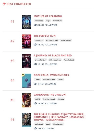 But the cool thing is, that with the posting of this last chapter, the 379,000+ words of these three books changed to "completed" other than "on-going," and because people have been rating the stories so highly it is now the #6 of the BEST COMPLETED list - and since the top 10 show up on Royal Road's Home Page, it may get some more attention now. Here's hoping!
