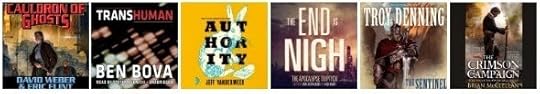 Cauldron of Ghosts: Honorverse Wages of Sin, Book 3 by David Weber, Eric Flint (Narrated by Peter Larkin)Transhuman by Ben Bova (Narrated by Stefan Rudnicki)Authority: Southern Reach Trilogy, Book 2 by Jeff VanderMeer (Narrated by Bronson Pinchot)The End is Nigh: The Apocalypse Triptych by multiple authors (multiple narrators)The Sentinel: The Sundering, Book V by Troy Denning (Narrated by Marc Vietor)The Crimson Campaign: The Powder Mage Trilogy, Book 2 by Brian McClellan (Narrated by Christian Rodska)