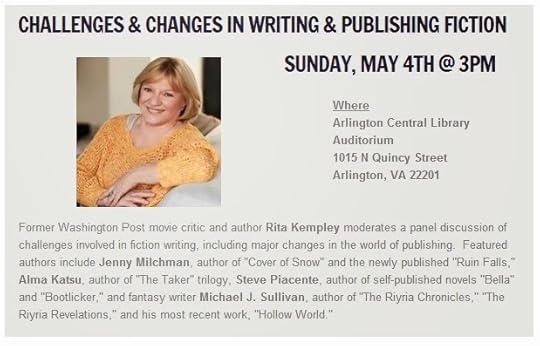 Today at 3:00 PM at the Arlington Public Library, I'll be on a panel talking about the challenges and changes occurring in today's publishing landscape. My wife will be on the panel as well as authors Jenny Milchman, Alma Katsu and Steve Piacente. The panel will be moderated by former Washington Post critic Rita Kempley and the whole event is being put together by the good people at One More Page Books.