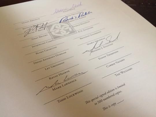 Shawn Speakman offered a limited edition hard cover version of his anthology that would be signed by all the authors—five hundred copies. I found the box filled with the unbound signature pages waiting on my stoop. Thankfully it wasn’t raining or the whole stack might have been ruined. That would have been bad since the box had already traveled to England and back.