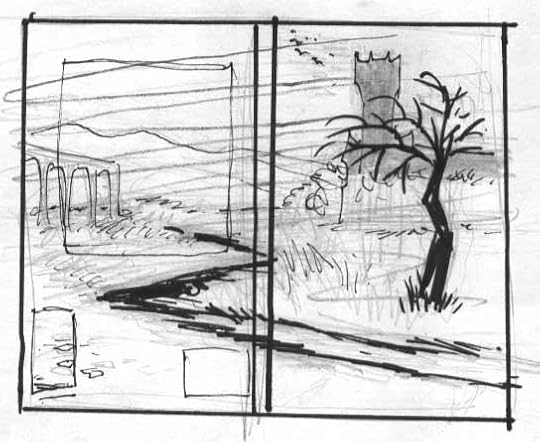I became concerned. The castle was too imposing, more like Dracula’s, the river looked like Harry Potter’s scar, and there was an aqueduct where the Winds Monastery should be. I also couldn’t figure out where they planned to put the title. With Robin’s encouragement I did a cover painting of my own and sent them this: