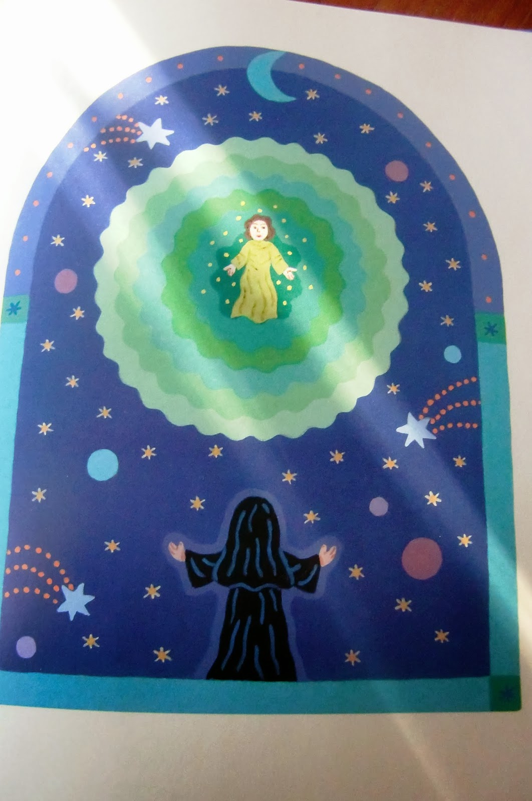 Jeanette Winter’s illustrations are a visual feast. Her color palette is bold, and she designed the book in the style of a medieval illuminated manuscript. Each illustration is framed with an arched border. It seems we are looking through a window at Hildegard’s life. One of my favorite illustrations shows Hildegard emerging from seclusion. She carries her candle, symbolizing the light she will come to share with the world.