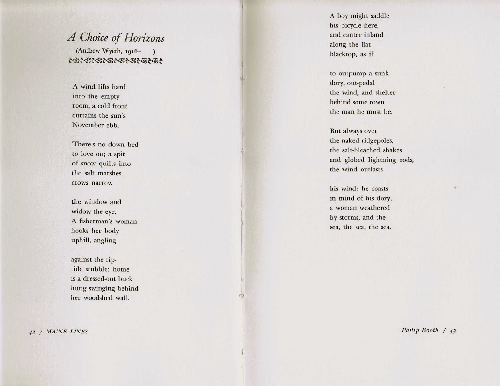 My day was awash in Booth’s “naked ridgepoles, salt-bleached shakes, and “the sea, the sea, the sea,” a choice of horizons, indeed! The day ended with a visit to the Wyeth exhibits at the Farnsworth Museum in Rockland. It’s a joy to read this poem after dwelling awhile with Andrew Wyeth’s paintings. I can “see” paintings like “Christina’s World” and others through Booth’s words and marvel at how he makes us look at that one boy out-pedaling the wind on his bike "to shelter behind some town the man he must be."
