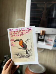 Probably the most important lesson I’ve learned in the last fifteen years is how important it is to be in conversation with other writers and build community with them. Raju Tai and I connected here on Substack when she sent me this photo above of a quote she wrote down while listening to my interview with Steve Almond about his newest book Truth is the Arrow, Mercy is the Bow: “Your job is not to get an agent or bestseller, it’s to outlast your doubt”.