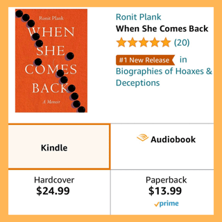 My memoir When She Comes Back officially became a book in the world on Tuesday, and I’m so thrilled to see it is at the time of this writing #1 New Release in Kindle Biographies of Hoaxes and Deceptions. It’s a category I didn’t know about, but I’ll take it!