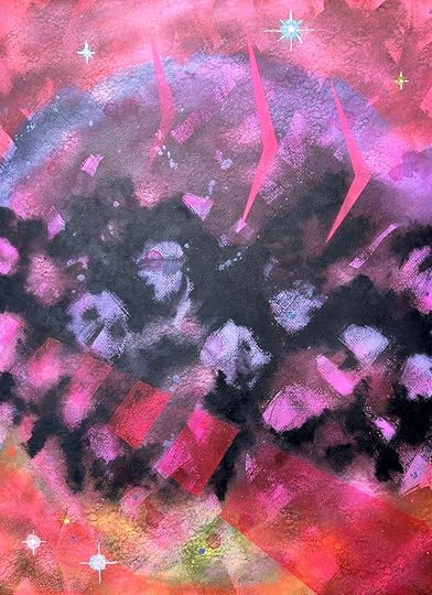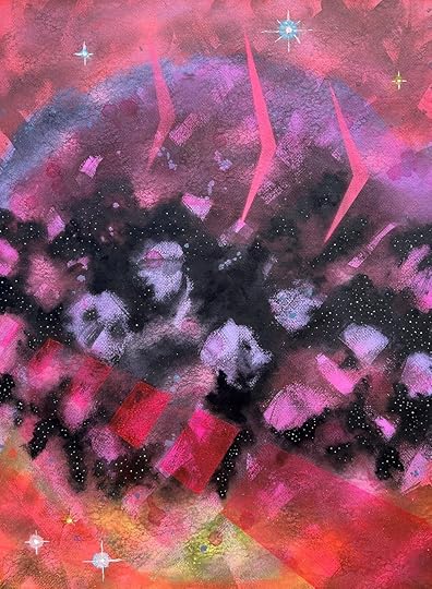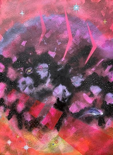 Terra Spatium Navis is another painting in which I try to depict a broad idea—the idea that a future spaceship might not look like what we are accustomed to, or that space travel might involve an object other than a spaceship, and, that space travel might take place between the fabric of space and time instead of through it. Some of you might be familiar with our 2017 visitor, Oumuamua—the first interstellar objected detected passing through our solar system. It grabbed my attention. What was it? Asteroid? Former comet? Extraterrestrial spy? Reddish in color, cigar-shaped and with a confounding constant rate of acceleration, It’s all conjecture, really, as scientists couldn’t observe it long or well enough. And now it’s gone. But that visit, as well as these other ideas, continue to orbit in and out of a solar system within my imagination.