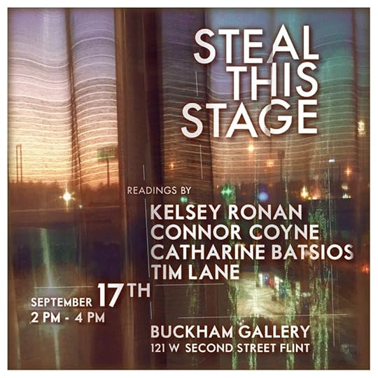 The reading event, Steal This Stage, which happened on Saturday, September 17, at Buckham Gallery in Downtown Flint, from 2-4 pm, was a blast. Such a memorable occasion! Here is a carousel of photos from the event. Pictured writers: me, Kelsey Ronan, Connor Coyne and Catharine Batsios.
