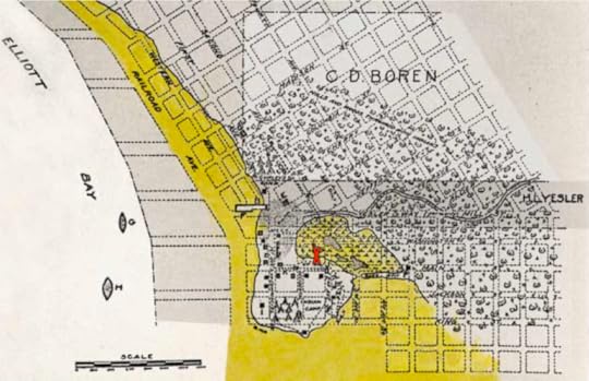 They maps are startling for how completely different they look from the modern city. Obviously, there is no urban infrastructure, or even any sign of humans, though we know that in the Seattle-to-be there was a well-developed Native community, with many longhouses housing several hundred people. But what stands out more to me is the look of the land and what it would take to travel across it. To get from what we call Beacon Hill to West Seattle would require a boat, unless the tide was out and then one could walk across mud flats. To leave the shoreline and go inland would require climbing steep bluffs, unless you slogged up a gully.