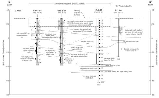 Another way to see what lies beneath is core samples. It’s not a pretty site down below. “Zones of sawdust and wood chips.” “Brick, mortar, asphalt, cinders, concrete, wood and charcoal debris.” “Very loose to loose WOOD debris; creosote/petroleum odor.” Basically, what one finds is the detritus of bygone history: the remnants of the Great Fire of 1889, Dutch Ned’s dumpings, and perhaps collections of garbage from early residents and industries.