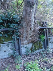 On 13th, however, the slabs and rails were used for the retaining wall. So sometime after 1965, either someone planted several Lombardy poplars on 13th or several invaded “naturally.”As one of them thrived, it grew around the old trolley rail, making for quite a nifty illustration of urban natural history.