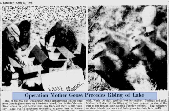 Operation Mother Goose, as the project was dubbed by Kennewick Game Farm Superintendent Curt Hedstrom, focused on collecting eggs on the Columbia River. The biologists knew that the eggs would soon be flooded out by the water rising by the nearly complete John Day Dam. After collecting the eggs, the men coddled them in goose down and put them in box, before flying them to Hedstrom’s game farm, which raised game birds for hunting. Most of the 1,200 eggs hatched and most of the young birds survived. Once the birds were old enough, the biologists planned to release them to wild flocks, where they hoped the youngsters would migrate with their elders.