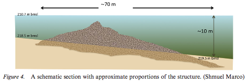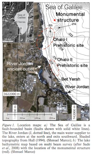 Archaeologists offer several interpretations for the cairn. The first, and the one I like best, is that it was built underwater to attract fish. Other similar structures described as fish nurseries occur throughout the Sea of Galilee, though they are smaller. It is also possible that it was built on land and that either rising water or a lowered ground surface, due to tectonics, lead to cairn’s present subaqueous location. There is evidence for the latter from a 23,000-old-site that apparently was buried during rapid subsidence. I like this theory, too.