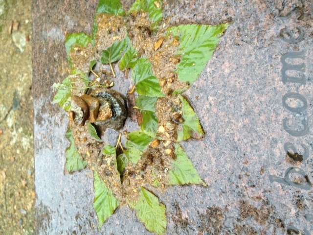 A trip to Concord, Massachusetts, produced this darned nifty photo. A friend of mine was accompanying a colleague’s junior year English classes on a Thoreau/Transcendentalist – themed field trip to Walden Pond and adjacent sites. One such site is on conservation land in Concord where the Walden Woods Project (Ed Begley Jr. and Don Henley are biggies in the group) has made some trails with artistically and strategically placed Thoreau quotes in sculptural granite. (WWP also offers tours of Thoreauvian sights. For the tour of Henry’s cabin at Walden Pond they write “Leave behind a stone from your hometown at the Cairn, a site to honor the memory of Henry David Thoreau.) There’s also a contemplation circle made of big granite blocks inscribed with quotes from a variety of folks from Thoreau to Emerson, to MLK, to JFK and a dozen or so others. The cairn was arranged on top of one of those blocks.