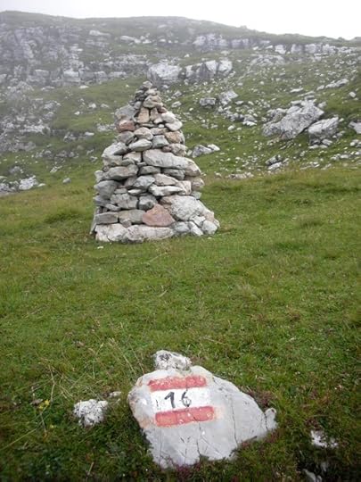 A cairn all the way from Italy. My pal Terry was hiking with her man in the Dolomites when she saw this handsome cairn. They were hiking down from the Rifugio Puez, part of Italy’s amazing backcountry hut system (several years ago I visited a refugio where we got espresso and lardo–mmmm!), and had just seen a “cute flock of sheep,” when they came across this pile of dolomite cobbles and boulders. She said she took a photo of it because it was so nice looking and because she happened to have her camera available instead of being deeply buried in her pack. Grazie Terry.