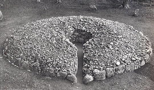 The cairn below is one of three that make up the Clava Cairns, or Balnauran of Clava, built around 4,000 years ago near what is now Inverness, Scotland. This type of cairn is known as a passage grave. It is 55 feet wide. At one point it was probably roofed. Recent work has shown that this cairn, along with the two nearby ones, were used as celestial markers, most likely noting the mid-winter solstice. Archaeologists believe that a focus on the winter solstice and the time of increasing daylight affirmed and strengthened the concept of rebirth, not just for the natural world but also for the dead. Together these powerful concepts would have united the community, a central theme that I write about in Cairns: Messengers in Stone.